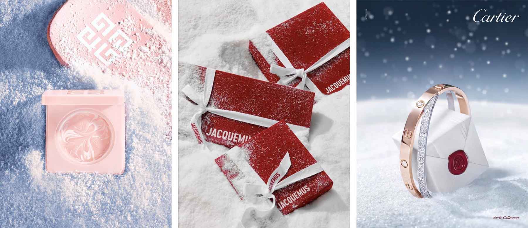 Waarom het werkt: Het roept winter en kerstgevoel op zonder de compositie te overheersen. Ideaal voor minimalistische of luxe producten.