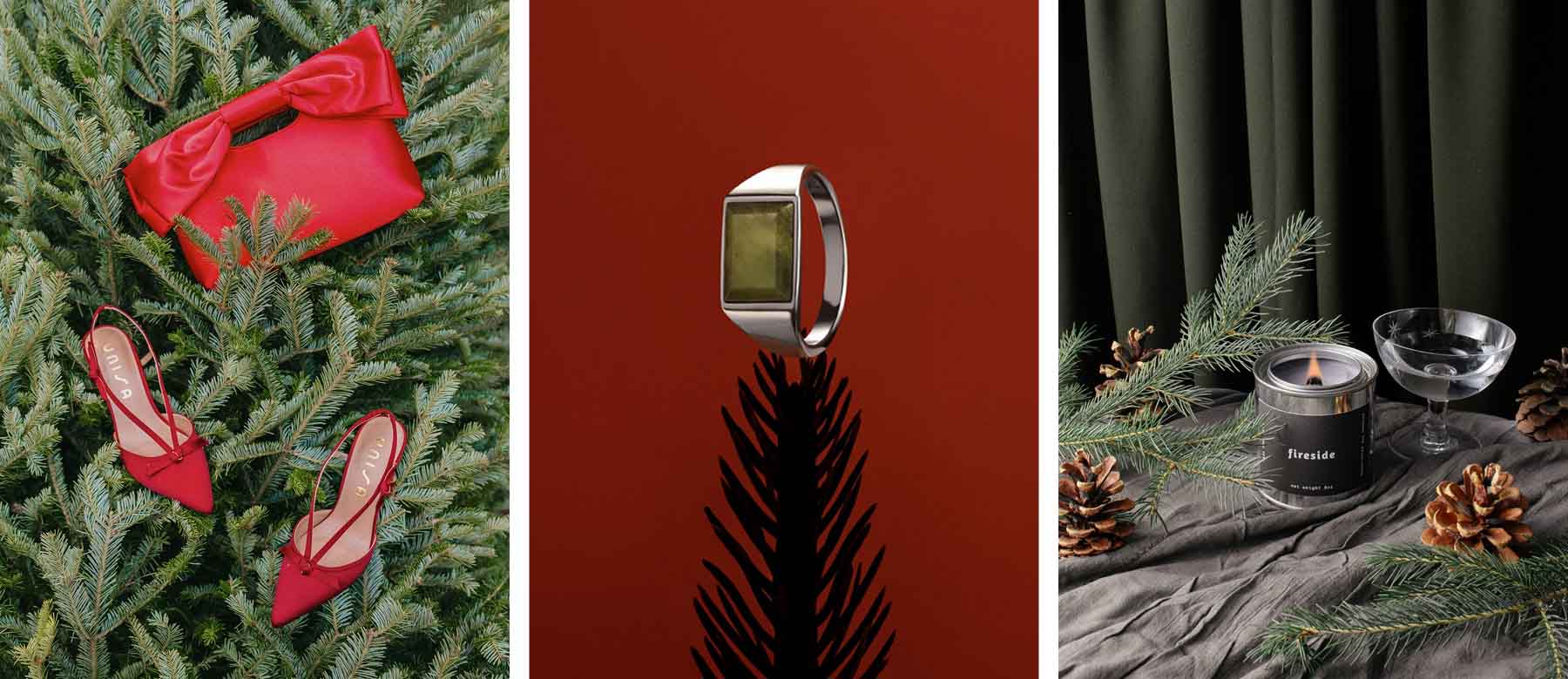 Voor een rustige, elegante uitstraling kun je dennetakken of dennennaalden toevoegen aan je kerstproductfoto’s. Het geeft een subtiel Scandinavisch gevoel dat toch feestelijk is.