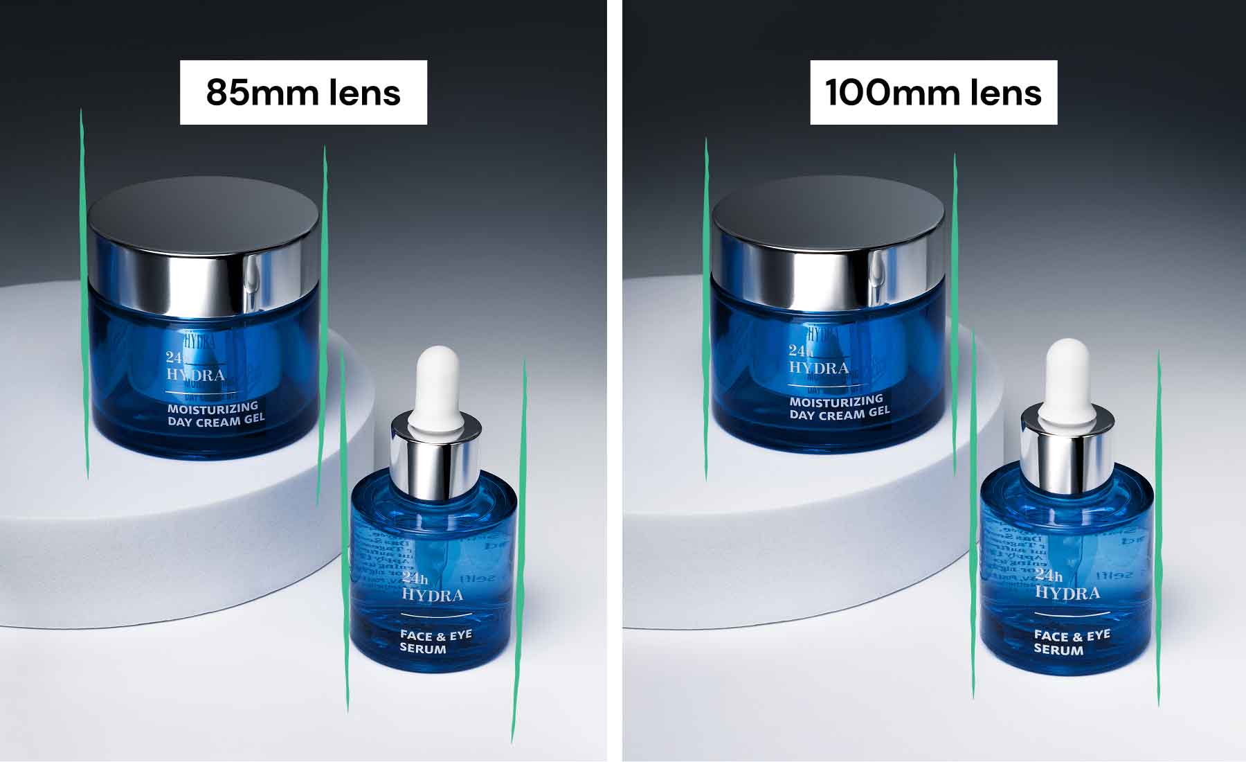 - Lange brandpuntsafstanden (zoals 85mm, 100mm of 135mm) zijn tele- of macrolenzen. Ze comprimeren de scène en houden lijnen rechter. Daarom zijn langere lenzen ideaal voor professionele packshots: ze verminderen perspectiefvervorming en behouden natuurlijke proporties.